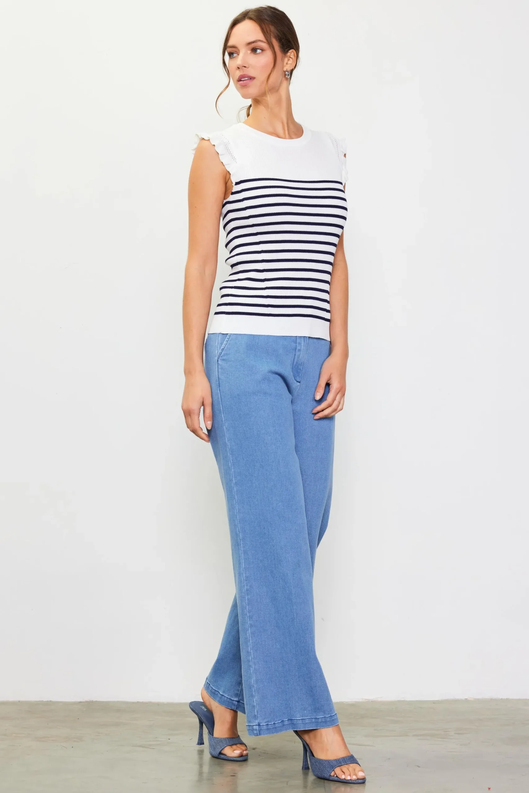 Nautical-inspired stripes lend coastal allure to this comfortable rib-knit top. It’s designed for a close fit and features ruffled cap sleeves with pointelle detailing.