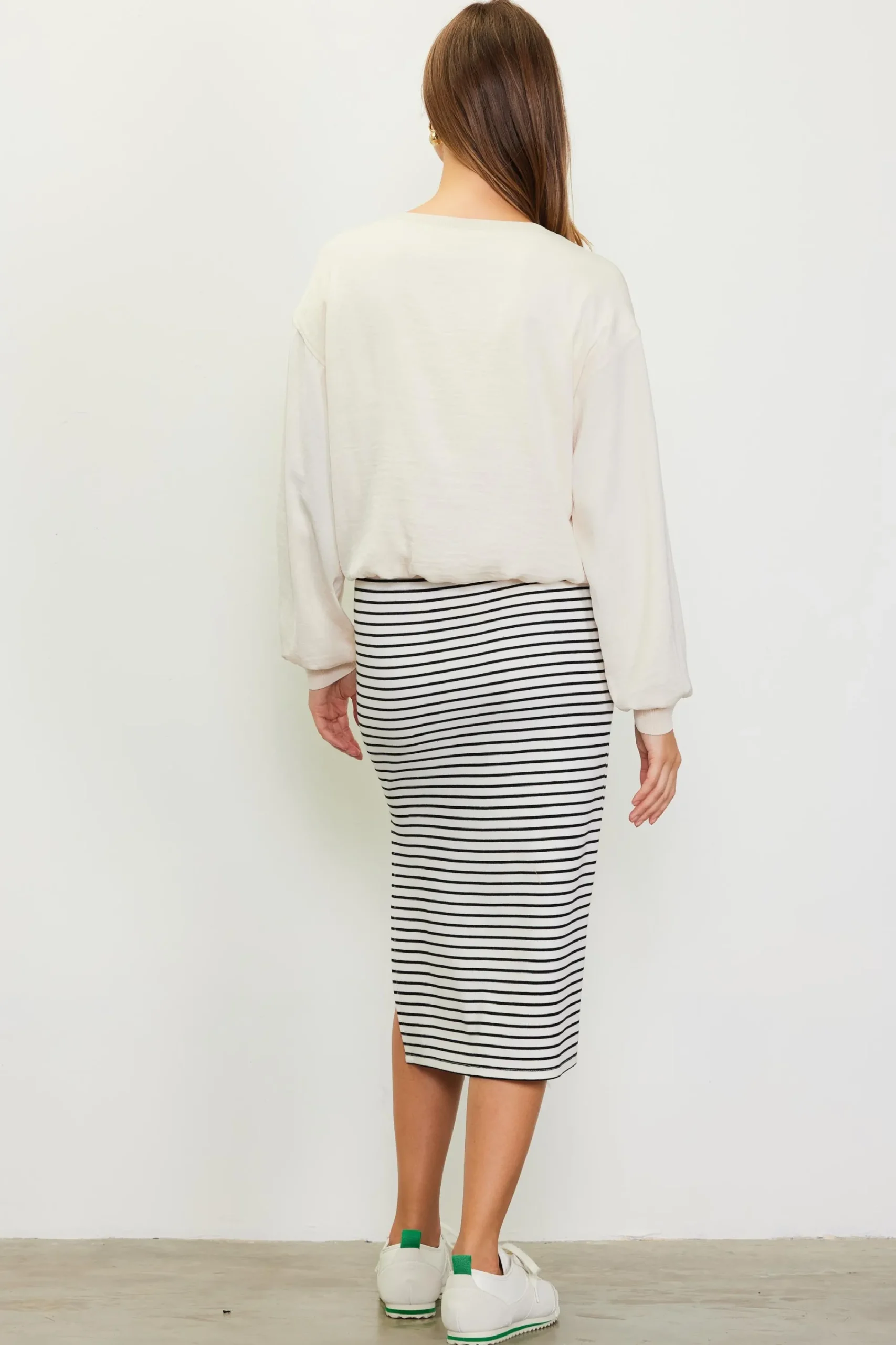 This striped knit skirt is easy to wear in a simple silhouette that lands below the knee. It has a fully covered elasticized waistband and an alluring side slit for added comfort. Pair yours with the matching muscle tank to make an easy set.