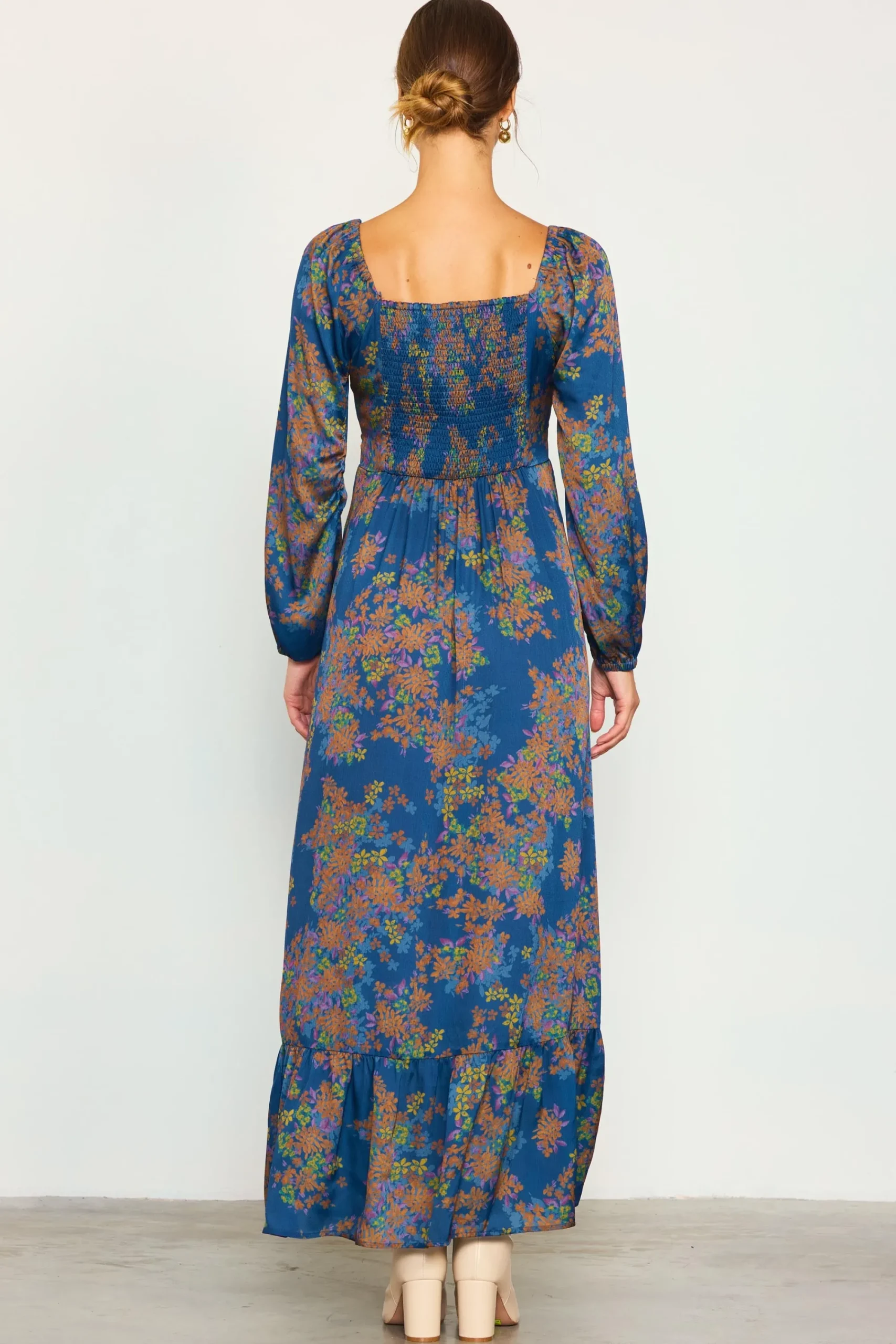 A floral-print maxi dress radiates femininity with its ruched sweetheart neckline, puffed sleeves, and ruffled hem. It’s smocked at the back for enhanced comfort.