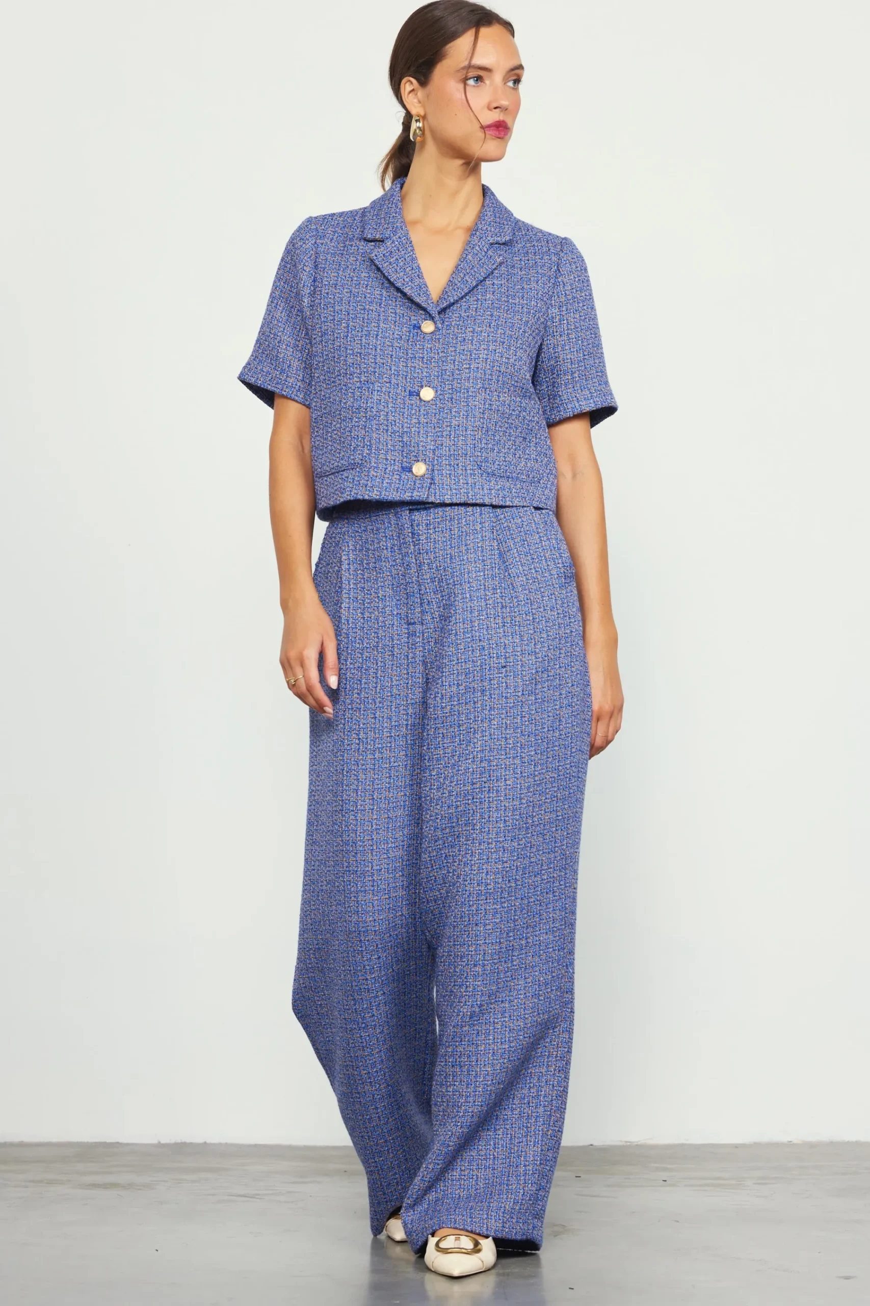 A tailored tweed jacket, updated for the warmer seasons. This cropped number is designed with notched lapels, patch pockets, and embossed buttons at the front. It wears especially well as a set with our matching tweed pants.