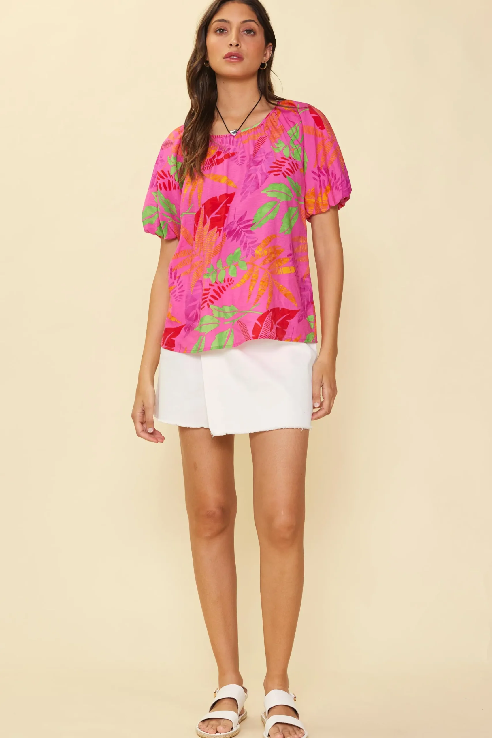 Bright and punchy in an eye-catching color palette, this tropical-print top has a gently gathered neckline, billowing bubble sleeves, and a sweet tie detail at the back. A standout of the season.