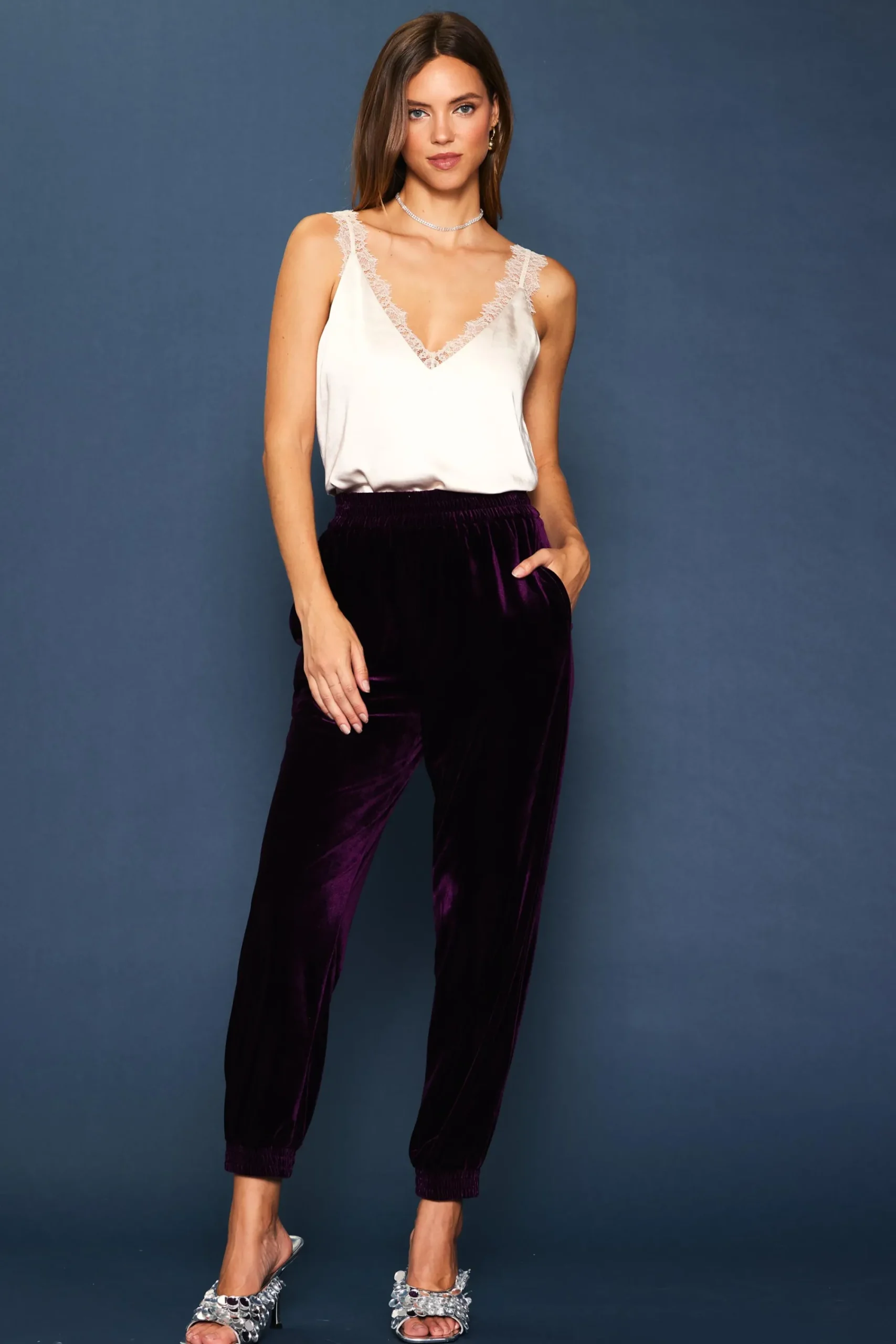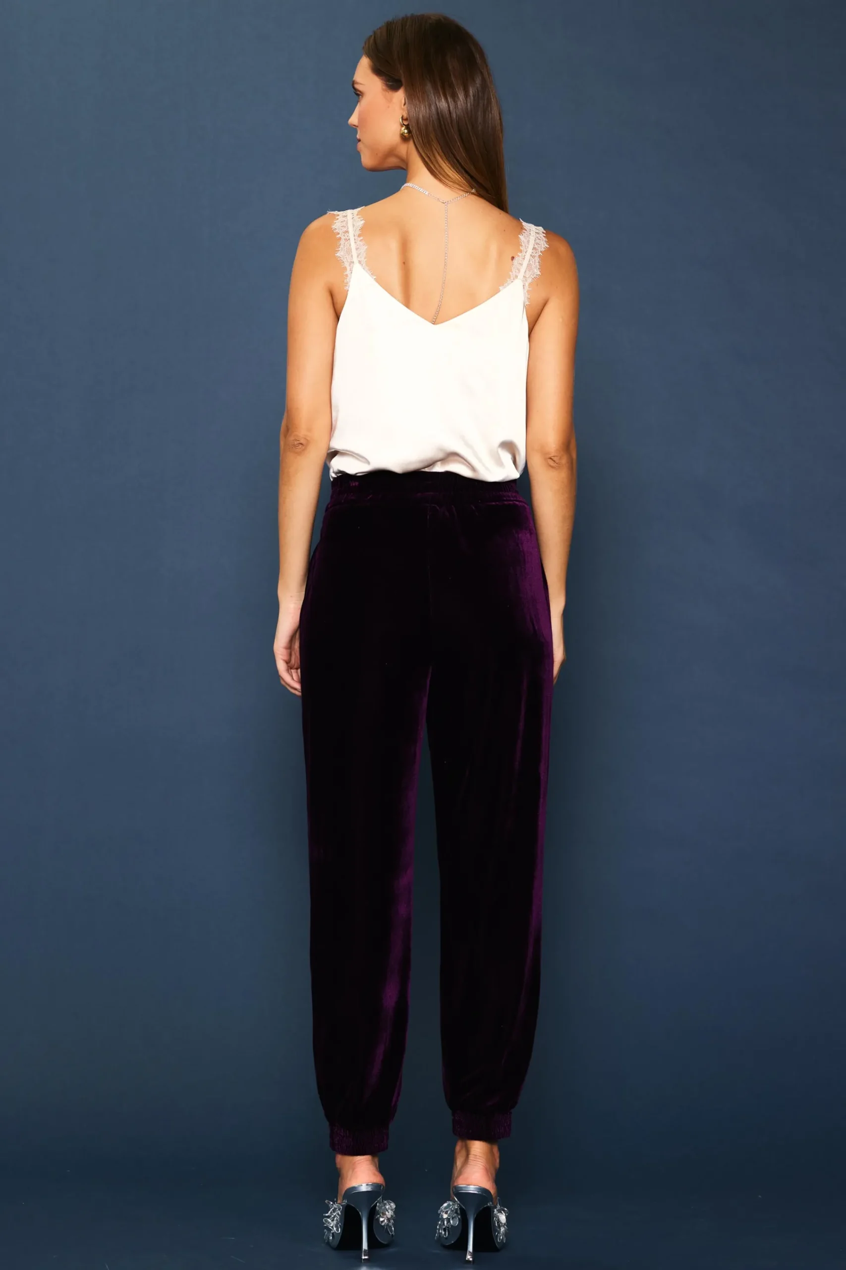 Soft velvet upgrades the essential jogger pant. Featuring an elasticized waist and a relaxed fit with cinched ankles, this lustrous pair can easily be dressed up or down. The look is luxe, the feel is lounge.