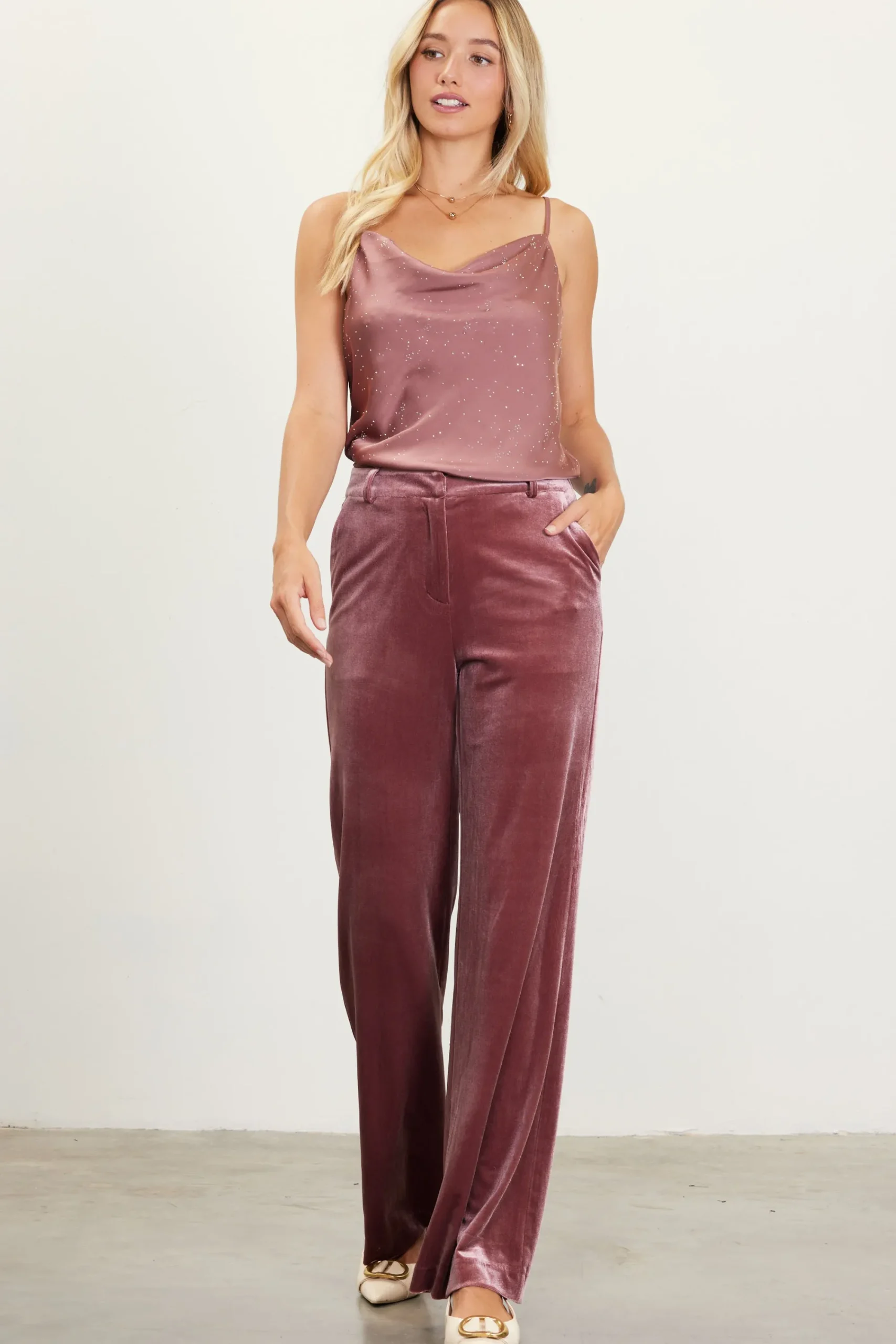 Step up your night-out ensembles with these lustrous velvet pants. Tailored with streamlined pockets, the pair sits high on the waist and has a flared silhouette. It’s elasticized at the back for enhanced comfort. Add our matching velvet blazer to create an occasion-ready pairing.